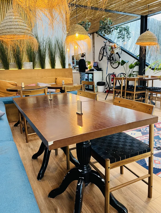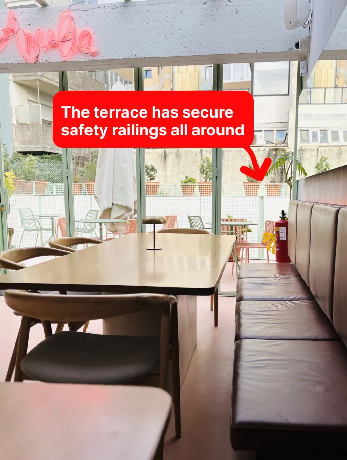 It’s a 2min walk from the beach, open all day, with a plant‑filled interior, great service, and a very family‑friendly setup with benches, high chairs and pens and paper. The terrace is protected, so kids can move around safely. The plates are on the smaller side, which is great if you don’t have a big appetite.