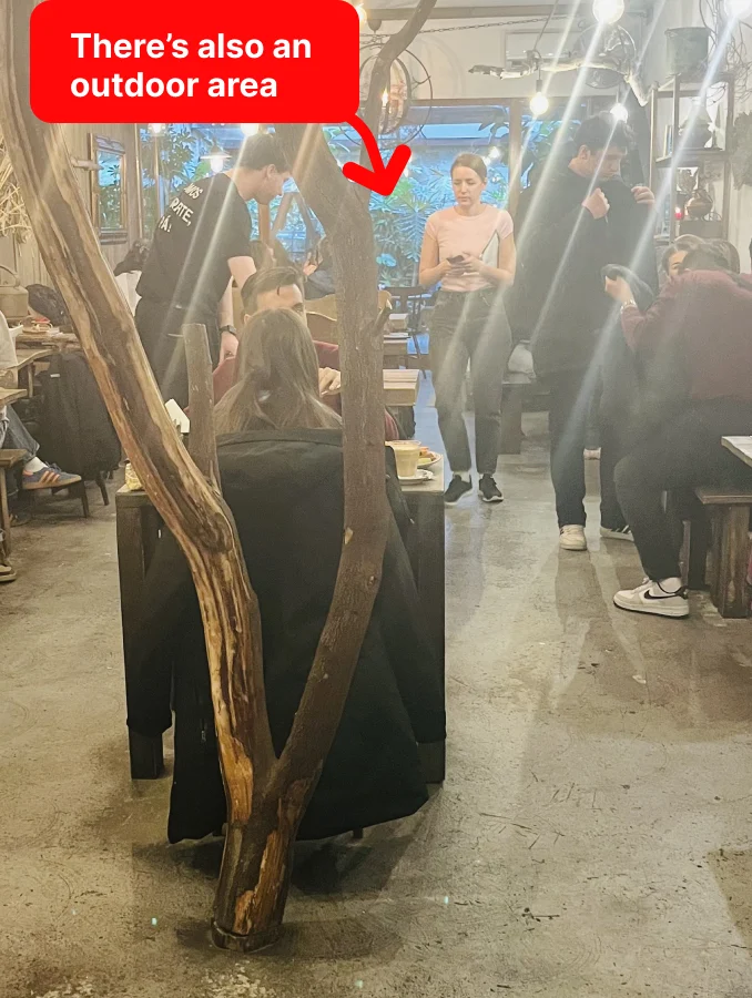 Beautiful decoration with a tree in the middle, high chairs, and a changing table, making it very family‑friendly. There’s a wide terrace overlooking the river mouth, right by tram line 1 and bus line 500, but you need to watch little ones near the tracks.
